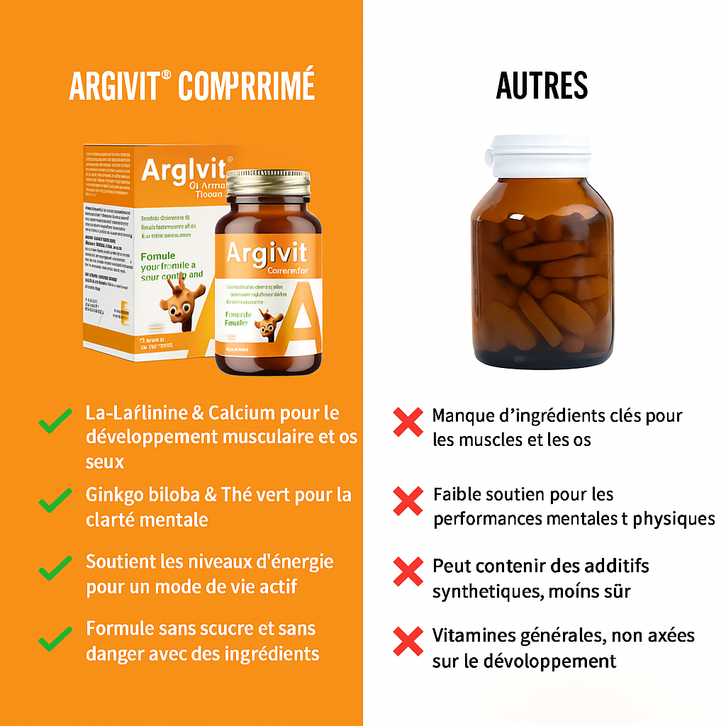 Oui, Argivit™ est différent : grâce à sa formule riche en vitamines et minéraux (Calcium, Vitamine D3, Zinc…), il soutient directement la croissance naturelle et le renforcement des os.